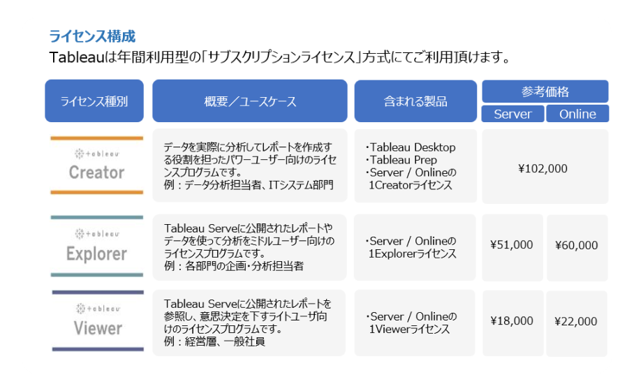「Tableau Desktop」は、1名から導入可能で、高価なサーバ機器の購入・設定も不要です。